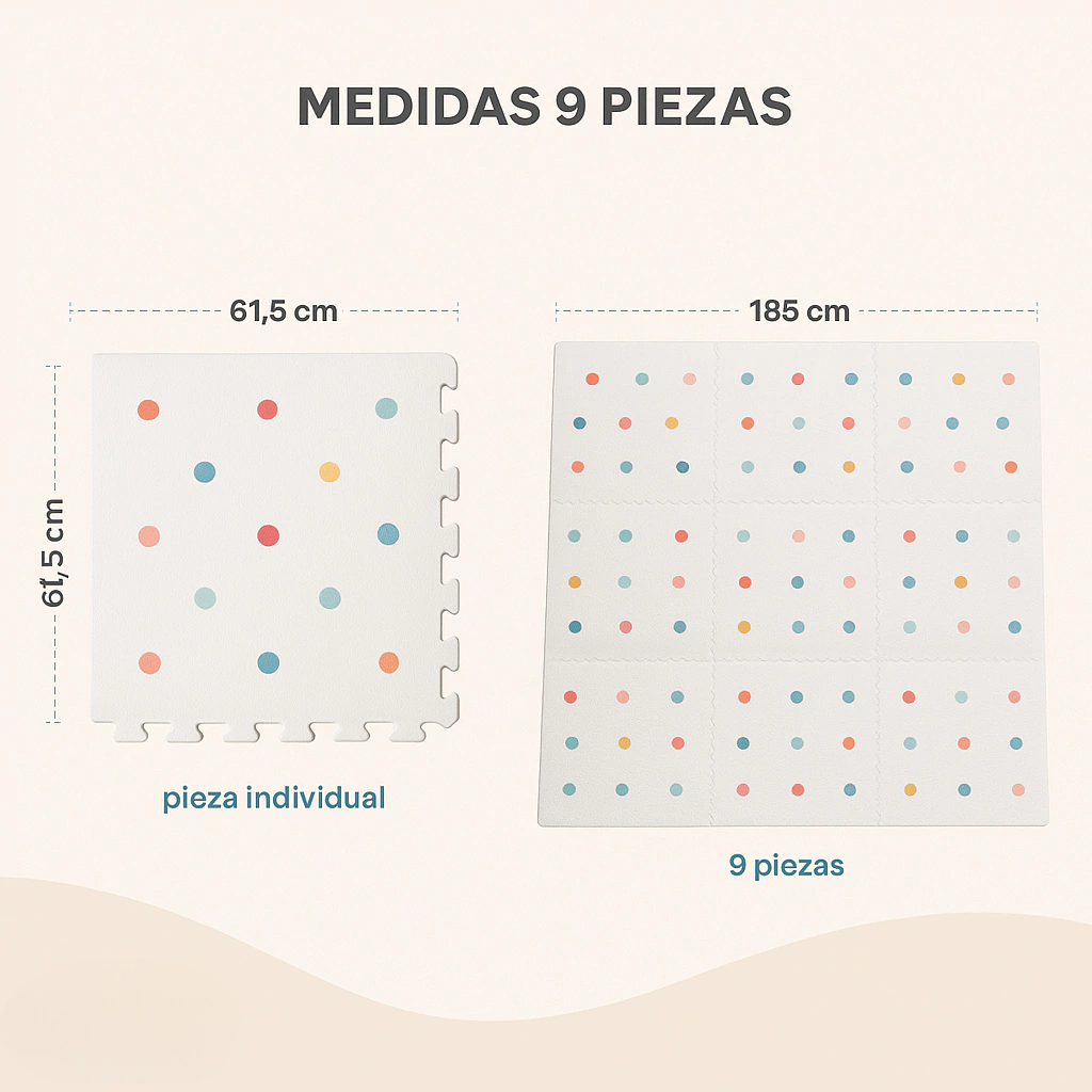 Versatilidad: Perfecto para usar en el hogar, en el gimnasio o en cualquier área de juego, cubriendo un área de 3,35 m² con 9 piezas más bordes.