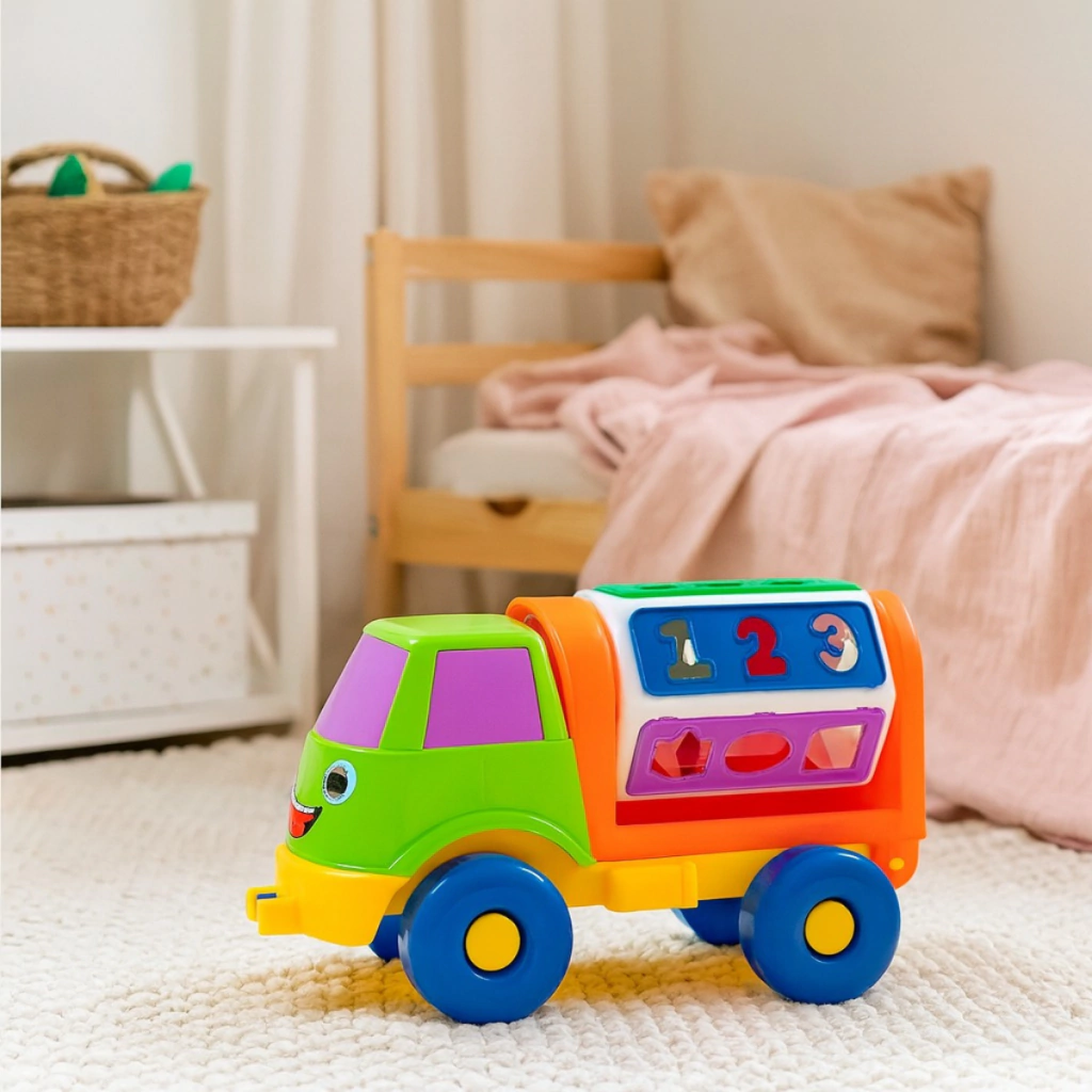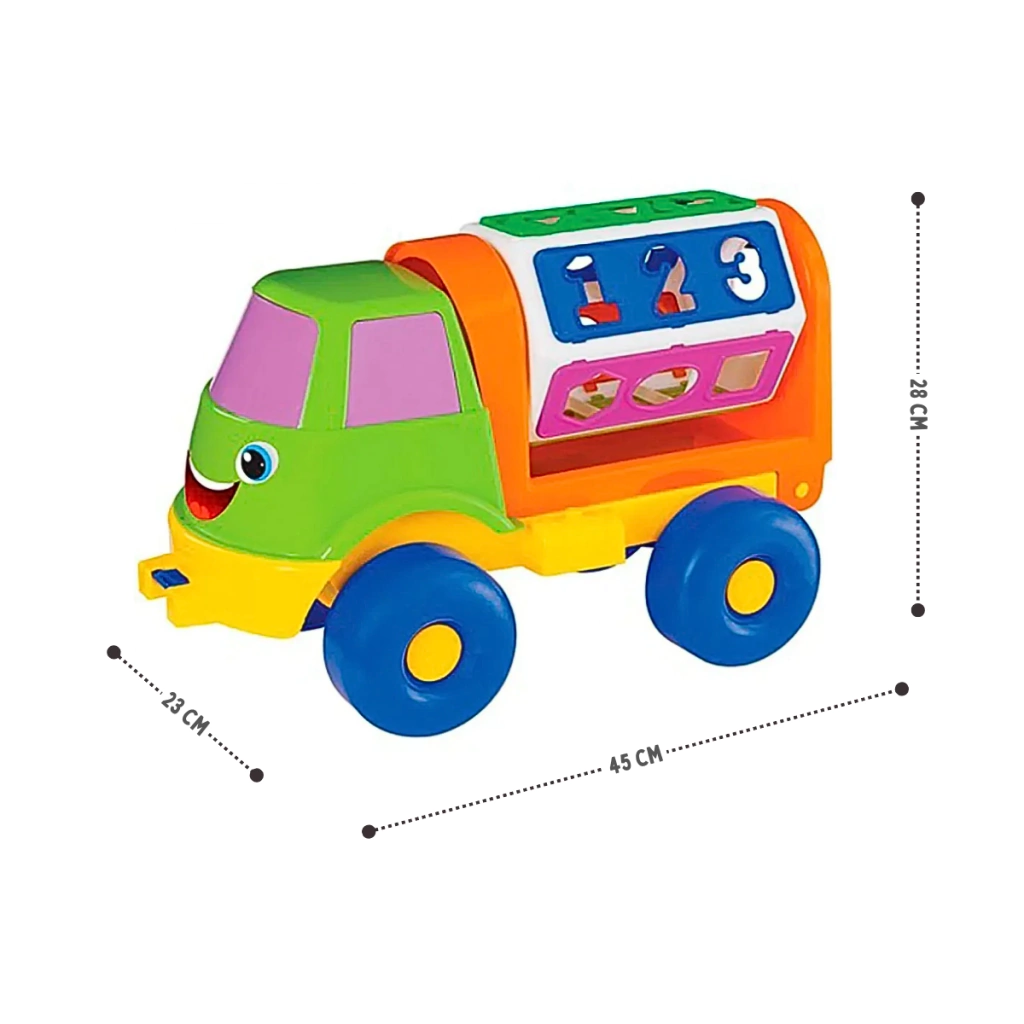 Este camión didáctico fomenta el desarrollo de la motricidad fina, la coordinación ojo-mano y el reconocimiento de formas, letras y números. Es perfecto para bebés y niños que comienzan a explorar el mundo mientras aprenden jugando.