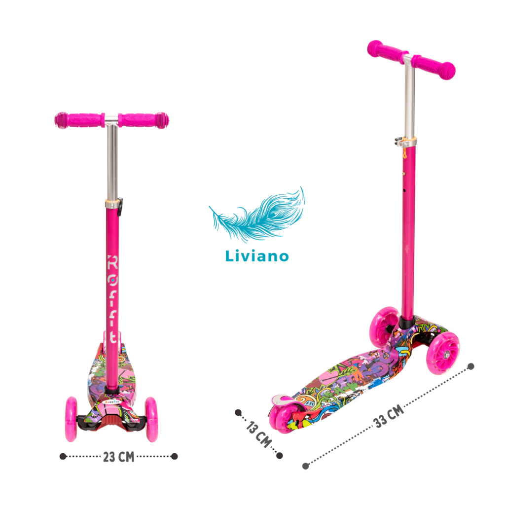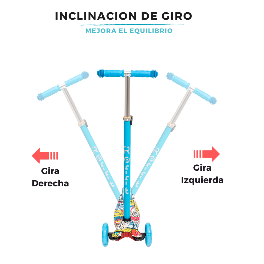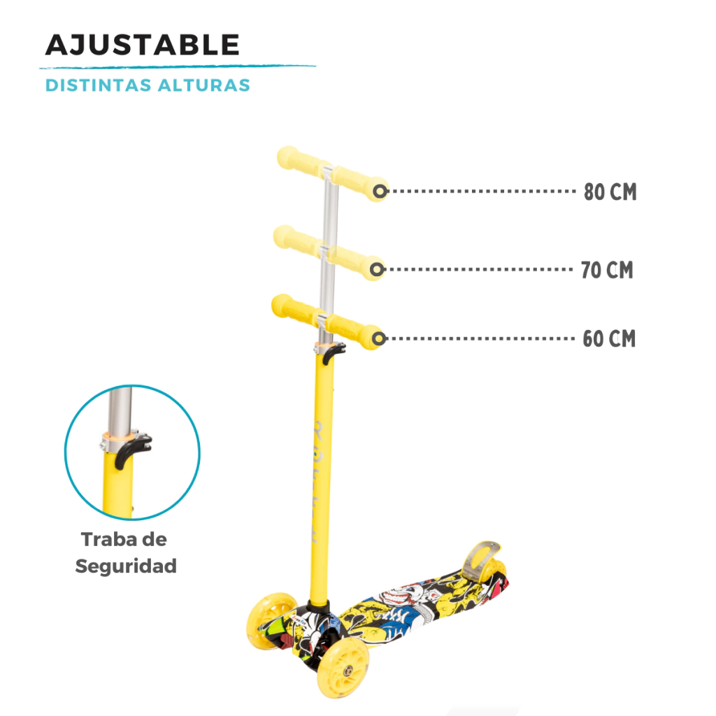 Este monopatín es perfecto para quienes buscan un producto divertido, seguro y estiloso. Su diseño atractivo en colores vibrantes como rosa, azul, amarillo y rojo, junto con el original diseño graffiti, hará que tu hijo destaque en cada aventura.
