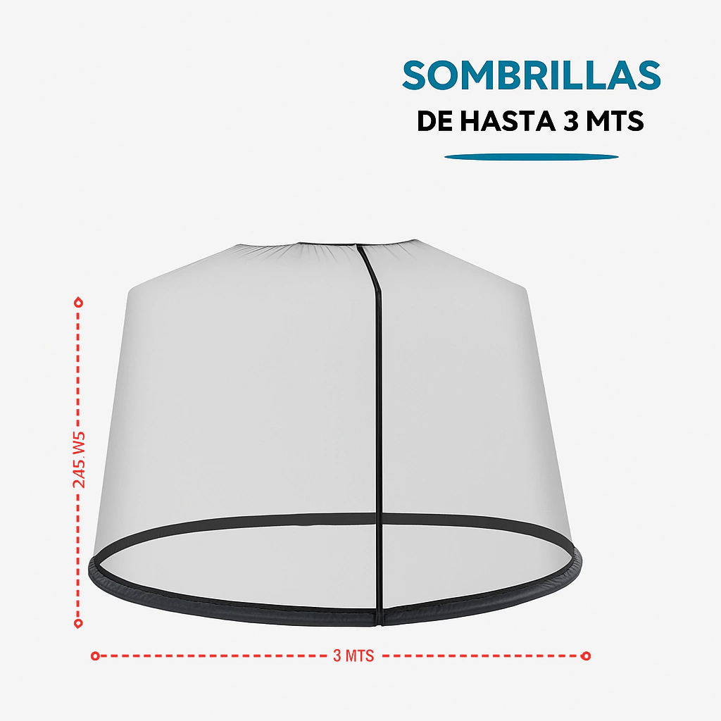 Diseño Innovador: Diseñada para adaptarse a sombrillas de hasta 3 metros, garantizando una cobertura completa y eficaz.