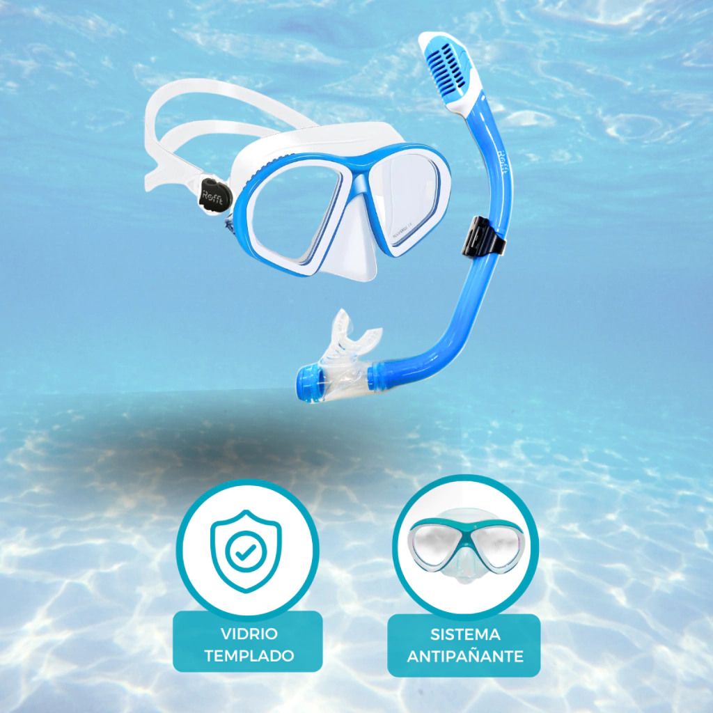 Descubre el Set Mascara Antiparra Rofft Snorkel diseñado especialmente para que los más pequeños disfruten de sus aventuras acuáticas con total comodidad y seguridad. Este set es ideal para días de playa, pileta o piscina.